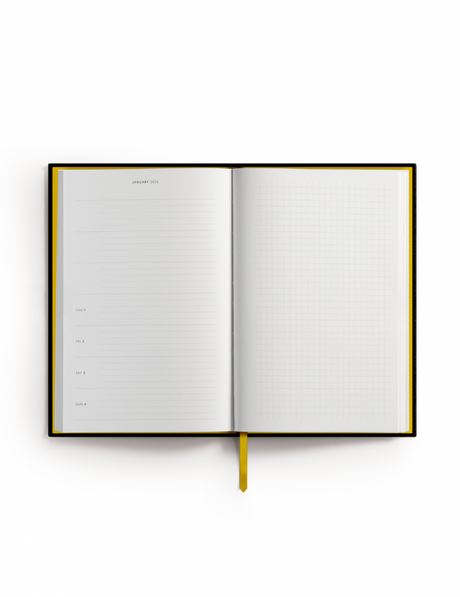 Wnętrze kalendarza zawiera planner tygodniowy w układzie poziomym, z dużą ilością miejsca na notatki i listy zadań.